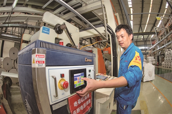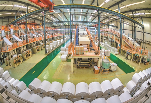 该公司紧跟国家低碳环保步伐,引进台湾尖端技术,以煤矸石等废弃物为原料,打造出国际领先的环保纸张,涵盖RP薄纸、RB厚纸及ST厚片材三种系列纸张,具有多项优点,并已通过多项国内外检测认证,广泛适用于文化、工业、包装及家庭用纸等多元领域。其年产量高达12万吨,相比传统造纸,大幅减少水资源与木材消耗,等同于造林32.4万亩,为山西绿色发展树立了标杆。图为宇皓环保纸业公司生产现场。