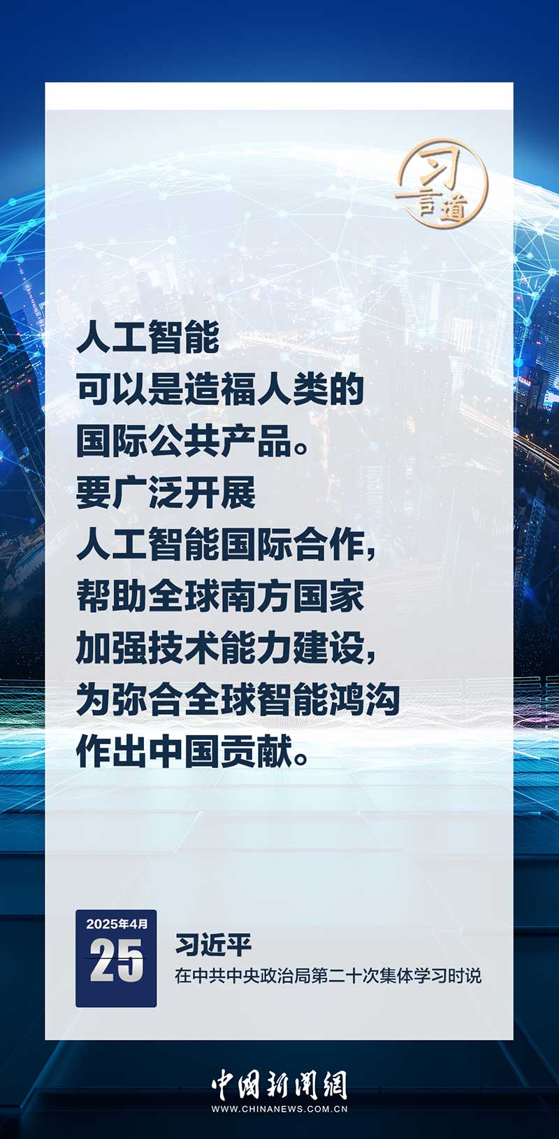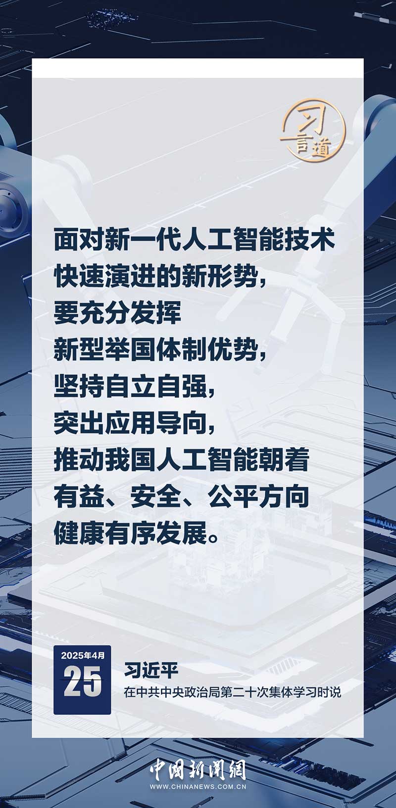 中共中央政治局4月25日就加强人工智能发展和监管进行第二十次集体学习。中共中央总书记习近平在主持学习时强调——