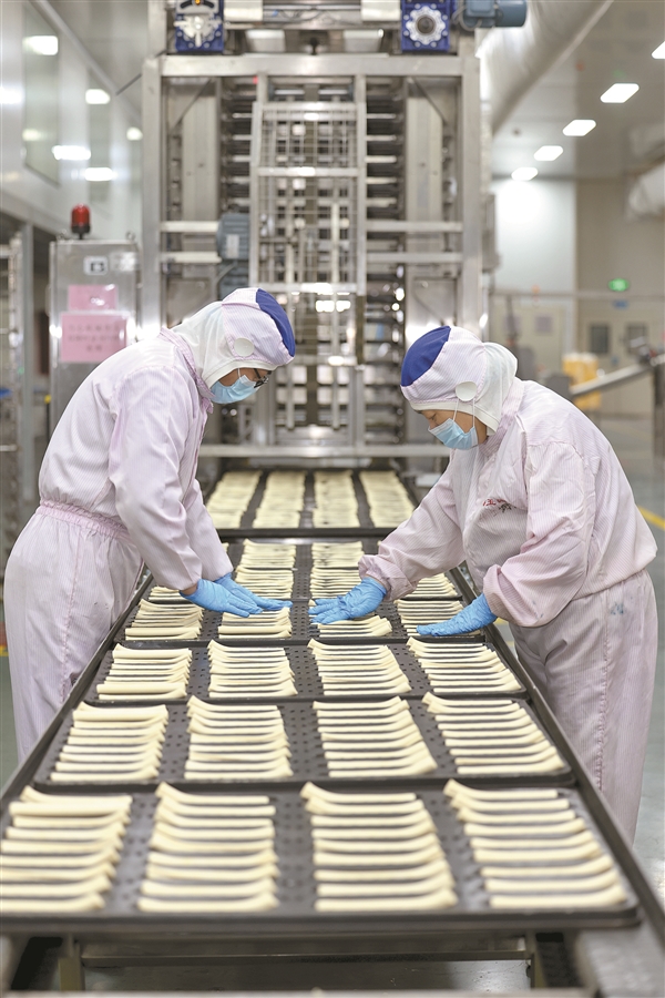 5月11日,山西海玉园食品有限公司石头饼生产车间,全自动的现代化生产设备串联出一条“行云流水”的生产线:和面、成形、铺石、烘烤……每一道工艺流程都实现了智能化、标准化、现代化。