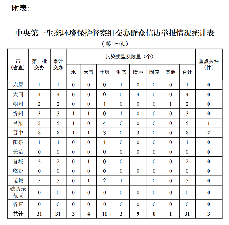 2025年5月29日,中央第一生态环境保护督察组向我省交办的第一批信访举报件,共31件,其中重点件3件。