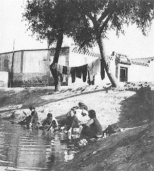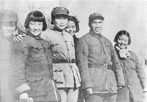 1939年,朱德总司令(右二)和康克清(左三)在总部驻地与重庆战区妇女儿童考察团成员陈波儿(左一)等合影