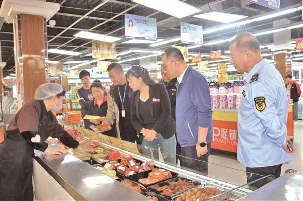 市场监管人员检查超市食品区。 记者 郭娟 摄