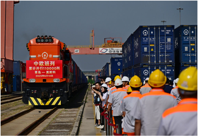图为6月10日在山东青岛胶州站拍摄的中欧班列。新华社记者 李紫恒 摄