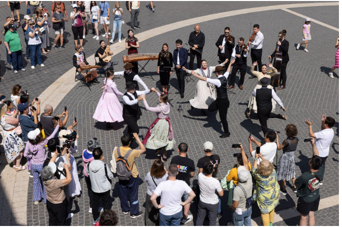 6月14日,为庆祝首个文明对话国际日,“对话·知音”文明对话国际日主题活动在匈牙利首都布达佩斯举行。图为中匈艺术家在城市快闪音乐活动上表演。新华社发(弗尔季·奥蒂洛摄)