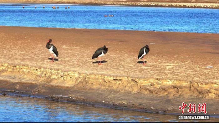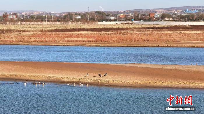 中新网忻州11月20日电 (杨静 张靓)初冬的黄河岸畔,静谧中孕育着生机。在山西省忻州市河曲县城黄河段,几只黑鹳悠然驻足、觅食休憩,优雅的身姿与奔腾的黄河、广袤的湿地绘就一幅和谐的自然画卷。