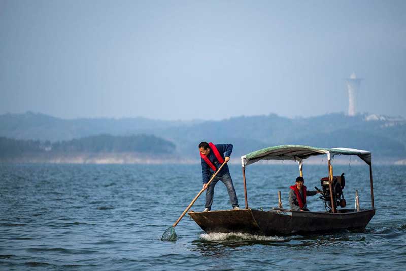 △2024年10月28日,湖北十堰丹江口清漂队队员在库区进行清漂作业。2023年,丹江口成立“小水滴”守水护水志愿服务队,越来越多人加入守水护水行列 。