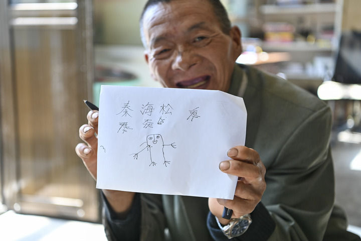 海松拿过纸来,正反面翻看一番,选择空白的那半页下笔。先是三条横线,一撇、一捺,然后是一横、一竖、一横。一个似“奏”似“秦”的字歪歪扭扭地出现了。旁人还愣着,他自己先“啊——啊——”地笑了出来,脸颊上的皱纹深深刻进皮肤里。