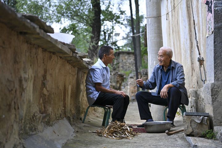 村民元有才(右)为秦海松准备好午餐后,两人相视而笑(8月6日摄)。新华社记者 杨晨光 摄