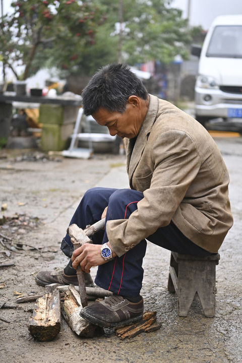 他像一个心无杂念的孩童,沉浸在手上的活计里。风声、雨声、围观的邻居,无法惊扰半分。砸了33下,一根直径十来厘米的圆木,被他劈成两半。