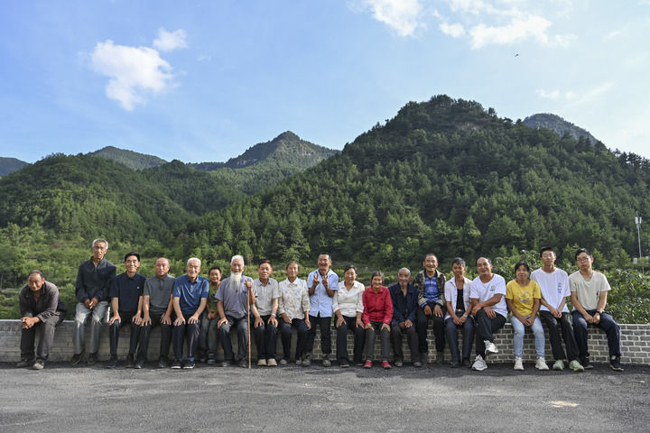 秦海松(左十)和部分村民在山西省平顺县黄崖沟自然村合影(8月27日摄)。新华社记者 杨晨光 摄