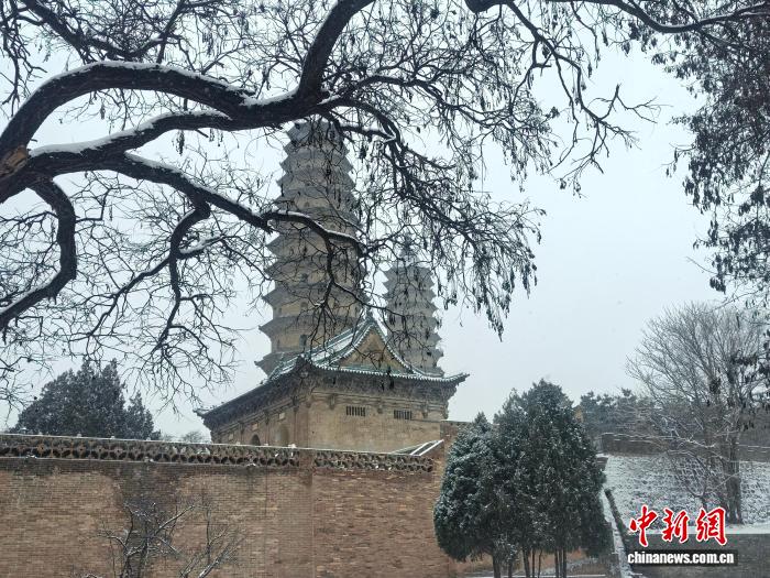 12日,山西太原地标古建双塔寺飘起白雪。田玙琛 摄