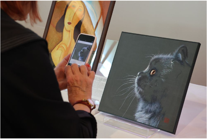 2025年9月4日,观众在法国巴黎中国文化中心参观《一针不多一针不少的苏绣》主题展时拍照留念。新华社记者 张百慧 摄