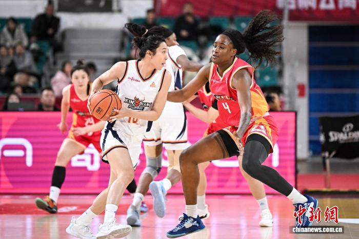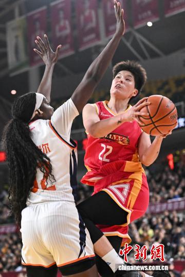 1月9日,山西队球员埃格博(红衣)在比赛中防守。当日,在太原举行的2025-2026赛季中国女子篮球联赛(WCBA)常规赛第14轮比赛中,山西竹叶青酒队主场以96比73战胜新疆天山队。中新社记者 韦亮 摄
