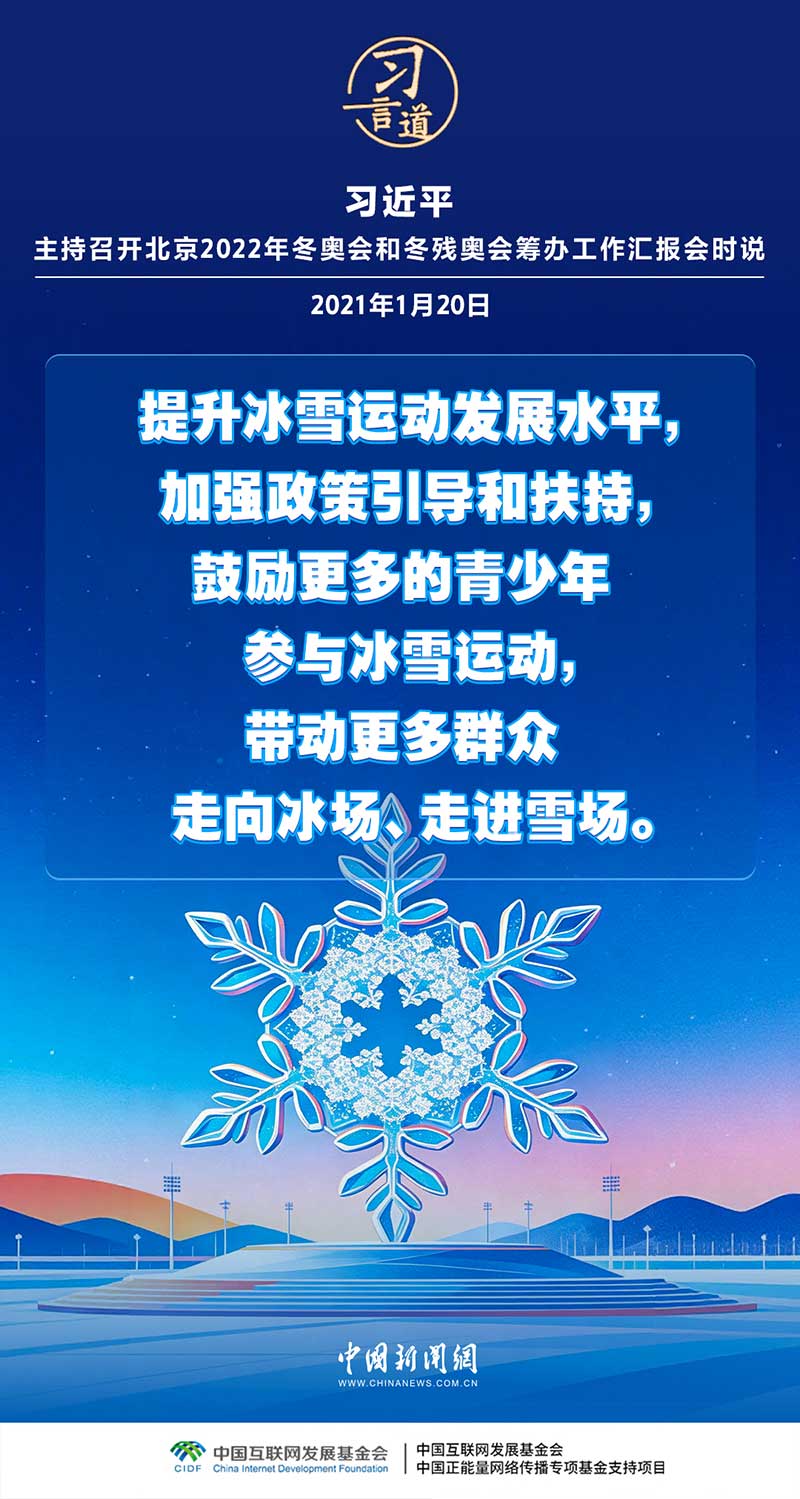 习近平总书记高度重视冰雪运动发展,多次寄语冰雪运动,强调“冰雪运动一定要全面开展”。在他的关心和推动下,冰雪运动跨过山海关,走进全国各地,开启了中国乃至全球冰雪运动新时代。