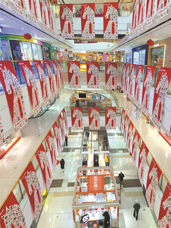 1月30日,在市城区新建万达广场,马年百家姓主题节庆装饰精致亮相,为商场添彩增辉。进入腊月,我市各大商场年味十足,马年主题的喜庆装扮随处可见,浓郁的新春氛围扑面而来。