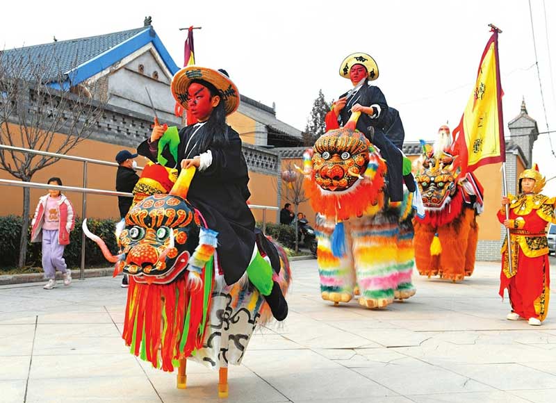 2月5日,稷山县清河镇阳城村文化广场上,国家级非物质文化遗产高跷走兽的市级非遗代表性传承人杨生全、儿子杨琪与5岁的孙子杨煜翔祖孙三代(由右至左),身着精心打造的“年兽”行头,踩着高跷联袂登台献艺,为新春表演做组合彩排,吸引了村民们驻足观看。三代人齐心协力守护乡土文化根脉,为古老的高跷走兽传承发展注入新的生机与活力。(栗卢建 摄)