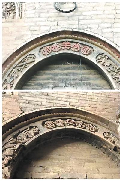 图为曹家大院西院窗楣砖刻篆字诗句。
