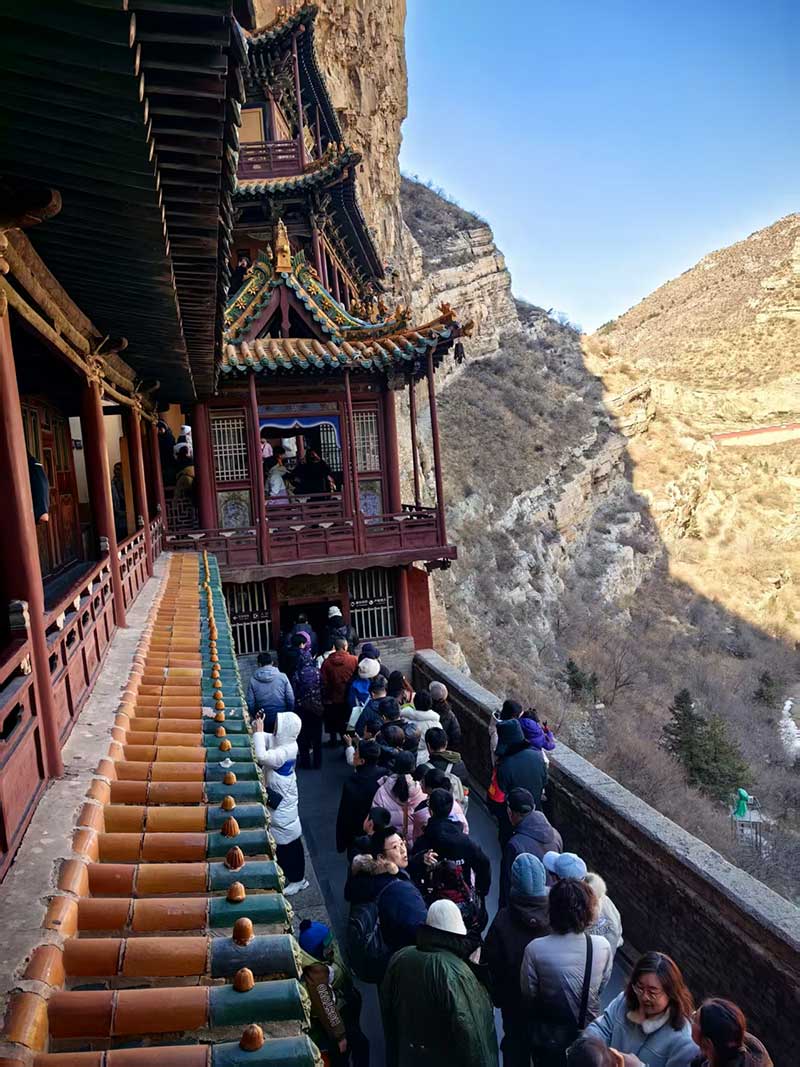 在悬空寺登临处等待区,精心准备的开水不时冒着热气。很多旅客来领取军大衣穿上,接一杯热水喝上,排队等待的时间不觉得长了,人也不觉得冷了。一位学生的摄影器材不小心掉到附近内湖的冰面上,保洁的同志主动想办法,用绳子拖拽,用扫帚划拉,帮助捡回来。