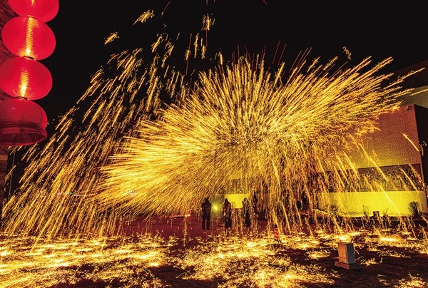 打铁花是我国流传已久的民间传统焰火,也是重要的非物质文化遗产。灼灼铁花与古朴的博物馆建筑交相辉映,场面蔚为壮观。绚烂的铁花不仅为当地群众和游客带来了一场震撼的视觉盛宴,更寄托着人们对新的一年生活红红火火、蒸蒸日上的美好期盼。