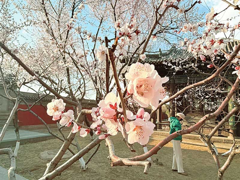 大同古城关帝庙内,争相绽放的春花与古建相映成趣。本报记者李强摄