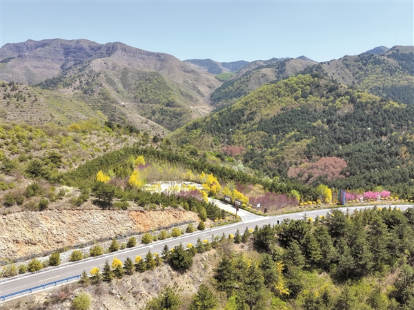 4月18日,太行一号旅游公路左权县麻田十字岭路段桃花、连翘花竞相绽放,金叶榆、紫叶李等景观树枝繁叶茂。多彩蜿蜒的公路、层峦起伏的山脉,与青松翠柏相映成景,绘就了一幅文旅融合的春日美丽生态画卷。