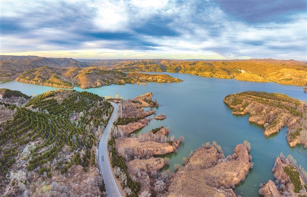 左权县清漳河国家湿地公园石匣库区 蓝天白云与青山碧水相映 现代交通动脉与自然风光相融