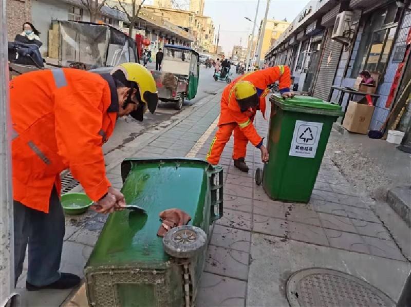 为进一步提升市城区环境卫生质量,提高环卫保洁的精细化程度,市环境卫生服务中心在做好道路清扫保洁工作的同时,对沿街垃圾桶、果皮箱进行了除污清洗。环卫工人对部分顽固污渍,采取刷洗再冲洗的方法,竭力保障垃圾桶干净、卫生。图为2月10日,环卫工人擦拭市城区文华东街果皮箱。