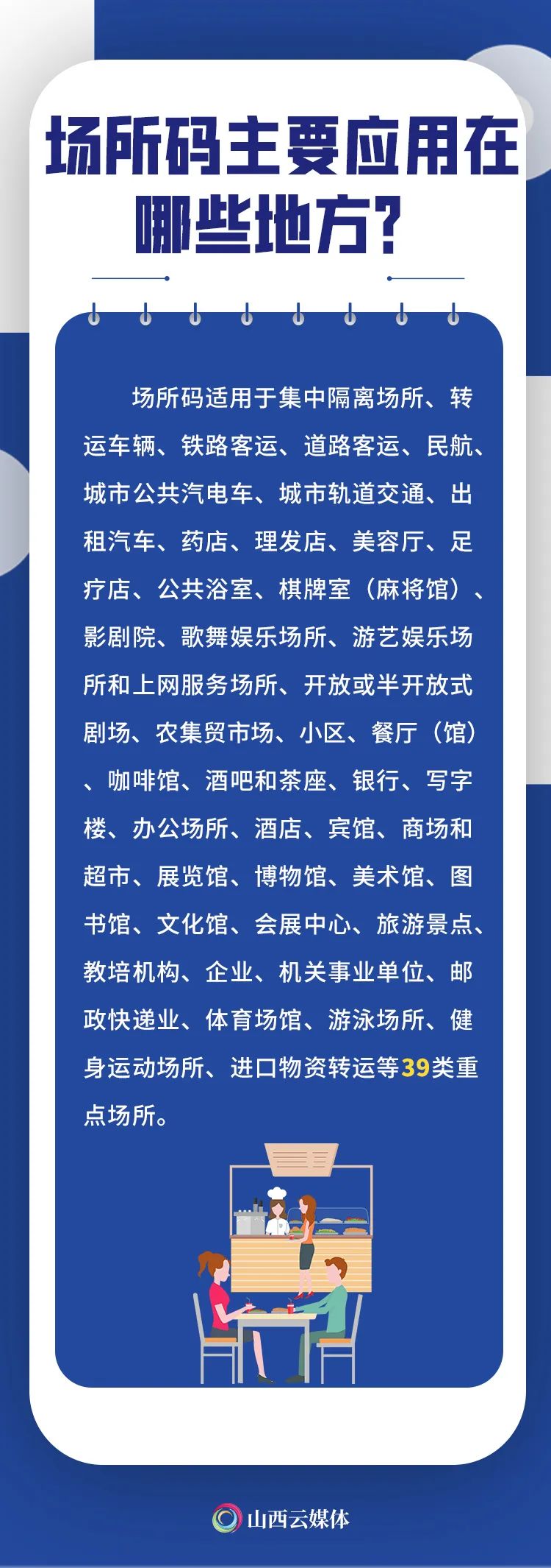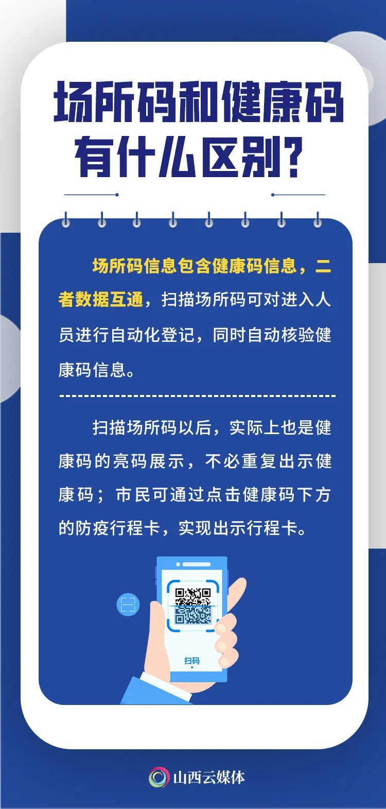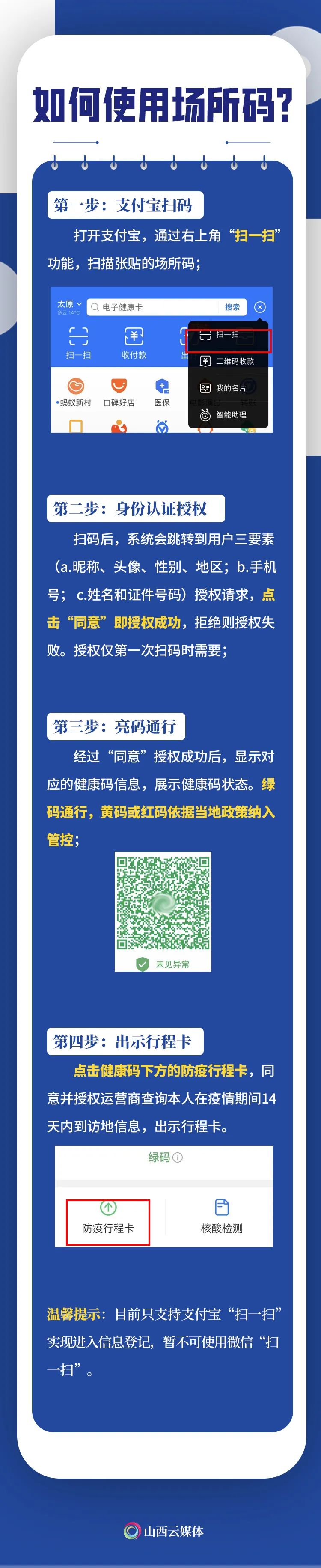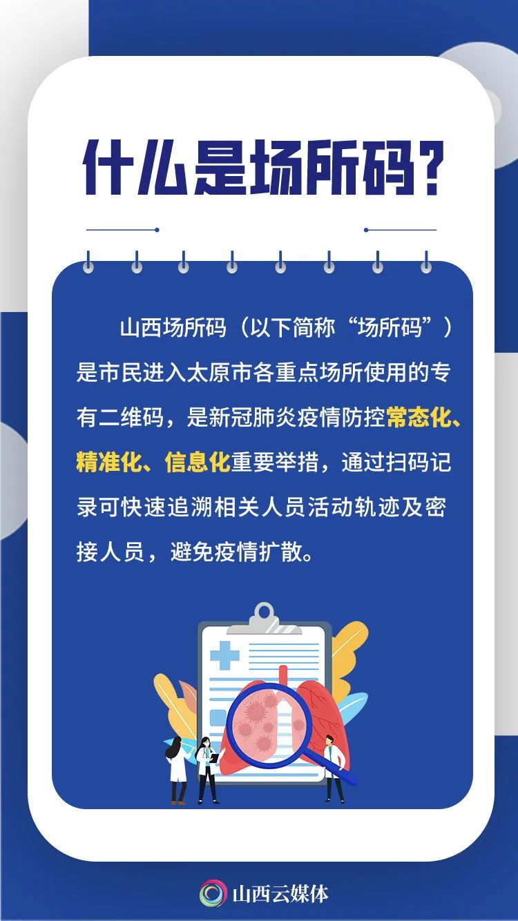 发挥大数据支撑作用,筑牢“数据围栏”,近日,太原市在全市范围内积极推进山西场所码推广使用。群众在进入太原市各重点场所时,通过支付宝“扫一扫”功能,扫描张贴在入口处或醒目位置的场所码,无需重复出示健康码,实现场所无接触打卡,便利通行。什么是山西场所码?和健康码有啥区别?你想知道的,都在这里!