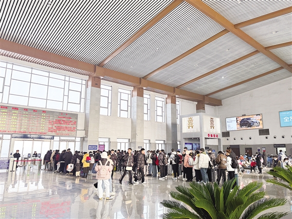 1月25日,在晋中高铁站内,人潮涌动、热闹非凡。许多旅客拉着行李箱,通过安检,进入候车大厅,在志愿者的引导下有序排队,等待登上回家的列车。