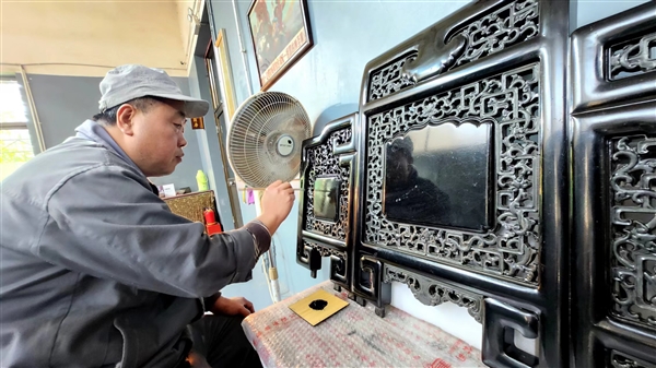 4月15日,在平遥县唐都推光漆器有限公司漆艺工作室,漆艺师正在精心制作推光漆器。该公司将非遗文化创意产品融入现代工艺品生产中,促进漆艺非遗技艺与文化创意产业深度融合发展。