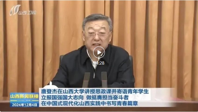 山西日报记者陈俊琦报道 12月3日,省委书记唐登杰来到山西大学讲授思政课,深入学习贯彻习近平新时代中国特色社会主义思想和党的二十届三中全会精神,寄语全省广大青年学生牢记领袖殷殷嘱托,立报国强国大志向、做挺膺担当奋斗者,在中国式现代化山西实践中书写青春篇章。省委常委、秘书长李凤岐参加。