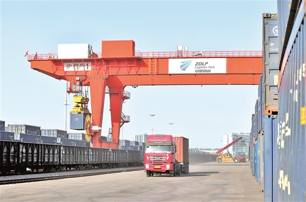 9月9日,在山西中鼎物流集团有限公司铁路港,工作人员正在进行装卸作业。目前,物流园已构建中鼎至15个国家、40多个境外城市站点的国际物流网络,成为中部地区中欧(亚)班列货物进出口集散中心。