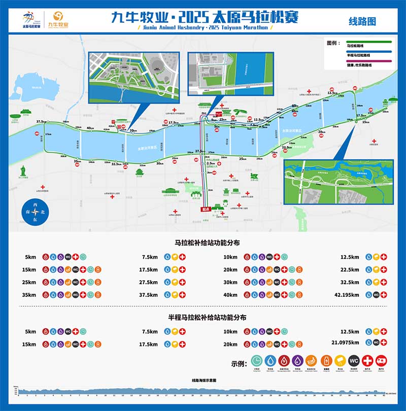 发令起跑后,从宽阔平直的迎泽大街出发,也将大幅提升出发的流畅度与仪式感。马拉松及半程马拉松延续迎泽大街衔接滨河东西路的经典赛道,马拉松路线取消祥云桥“心碎绕行”路段及终点前折返,助力选手保持奔跑节奏,充分发挥竞技水平,力争创造佳绩。