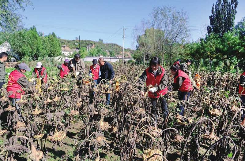 党员干部与群众在田间抢收向日葵。