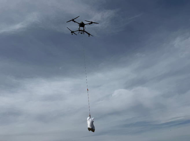 守在田埂上的飞手郭跃明,是个四十来岁的汉子。他盯着控制屏,拇指在操纵杆上轻轻一推,喊了声“走!”。只见悬着的铁钩稳稳扣住袋口,无人机嗡嗡升起,吊着百来斤的谷袋就朝转运点飞去。