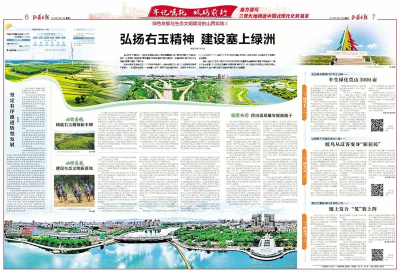 本报讯(记者任永亮)“我们脚下的这片土地,就是右玉县种下的第一片树林。”10月15日,站在右玉县南山森林公园丰碑雕塑前,顺着83岁退休老干部王德功手指的方向,映入记者眼帘的是数十万亩的松柏林,松涛阵阵,满目苍翠,草木特有的清新气息扑面而来。当初这个黄沙遍地的“不毛之地”,靠着代代接力,书写着绿色奇迹。