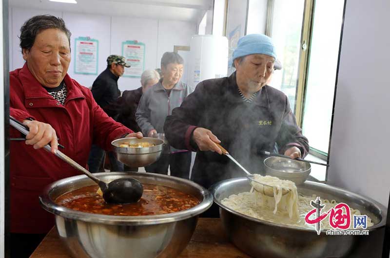 村里的日间照料中心,老人们在盛饭。中国网记者 杨楠 摄