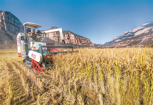11月1日,收割机在左权县马家楼村广袤的田野上收割优质水稻。通讯员 刘永红 摄