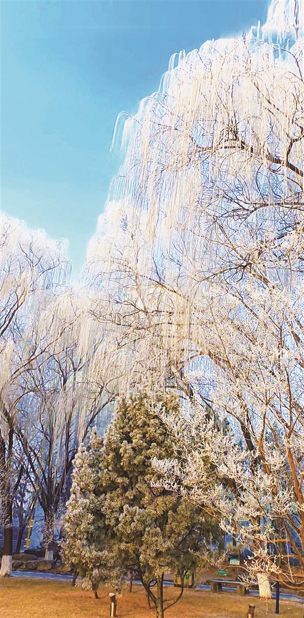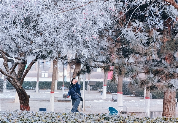 1月5日,市城区迎来雾凇景观,这种罕见的冬日盛景,吸引了众多市民驻足观赏。图为市民在市城区迎宾绿苑打卡定格冬日浪漫。