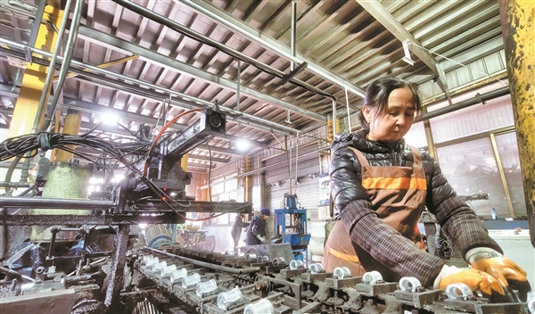 一月二十七日,在山西隆盛渊源科技有限公司机加工车间,工人正在套丝机前加工玛钢管件。近年来,该公司积极投资建设数字化铸造车间,实现生产全流程数据化管理。