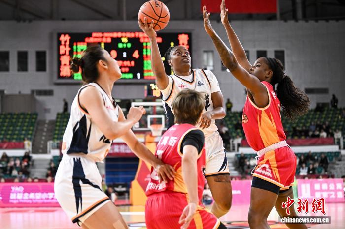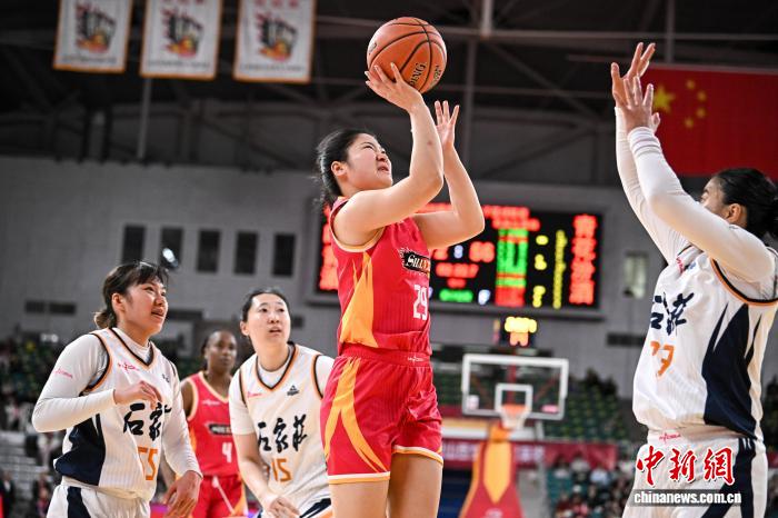 2月1日,山西队球员刘贝(红衣)在比赛中投篮。当日,在太原举行的2025-2026赛季中国女子篮球联赛(WCBA)常规赛第22轮比赛中,山西竹叶青酒队主场以97比94战胜石家庄英励队,以18胜4负的战绩获得常规赛冠军。中新社记者 韦亮 摄