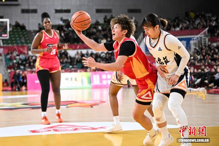 2月1日,山西队球员林育庭(红衣)在比赛中上篮。当日,在太原举行的2025-2026赛季中国女子篮球联赛(WCBA)常规赛第22轮比赛中,山西竹叶青酒队主场以97比94战胜石家庄英励队,以18胜4负的战绩获得常规赛冠军。中新社记者 韦亮 摄