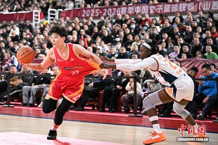 2月1日,山西队球员布朗(红衣)在比赛中持球进攻。当日,在太原举行的2025-2026赛季中国女子篮球联赛(WCBA)常规赛第22轮比赛中,山西竹叶青酒队主场以97比94战胜石家庄英励队,以18胜4负的战绩获得常规赛冠军。中新社记者 韦亮 摄