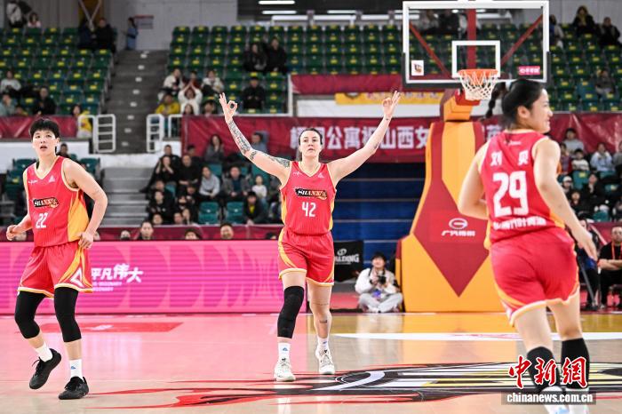 2月1日,山西队42号球员惠特尔(红衣)在比赛中庆祝得分。当日,在太原举行的2025-2026赛季中国女子篮球联赛(WCBA)常规赛第22轮比赛中,山西竹叶青酒队主场以97比94战胜石家庄英励队,以18胜4负的战绩获得常规赛冠军。中新社记者 韦亮 摄