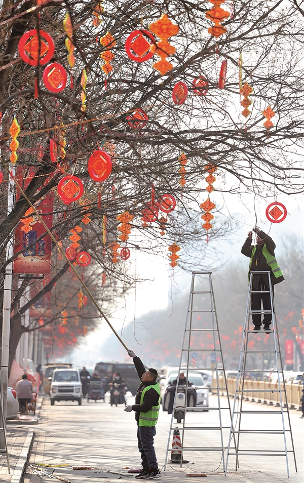 ❶街头挂彩灯装点城市。