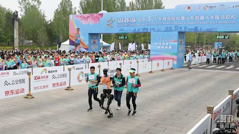 △2025年4月,全球首个人形机器人半程马拉松赛在北京亦庄举行。(图/视觉中国)