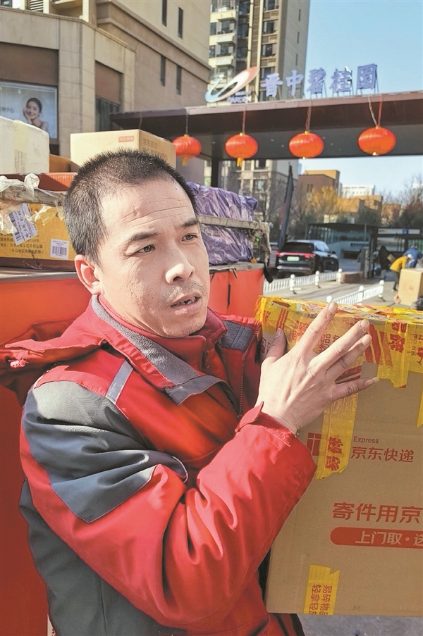 快递员陈建忠为消费者送货。