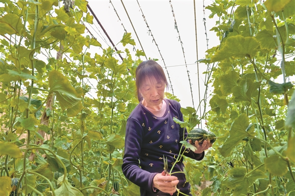 惊蛰时节,太谷区任村乡东贾村一处绿意盎然的温室大棚里,瓜农张文丽穿梭在藤蔓间,熟练地采摘“博洋9号”香瓜。新鲜的香瓜将带着清晰的绿白条纹、飘着浓郁的瓜香,第一时间走向市场。