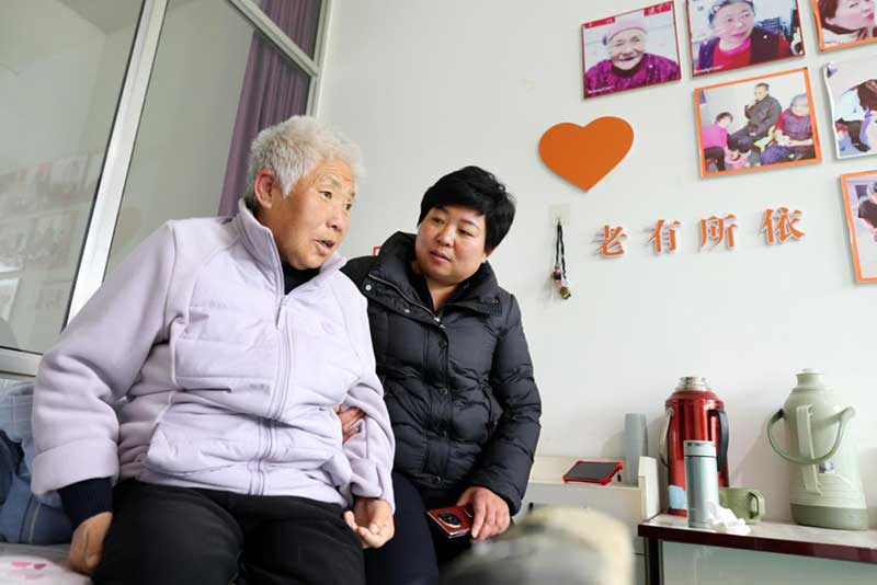 全国人大代表马金莲(右)在山西省吕梁市柳林县小成村一处养老服务中心与老年居民交谈。 朱兴鑫 摄