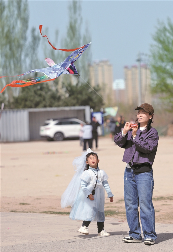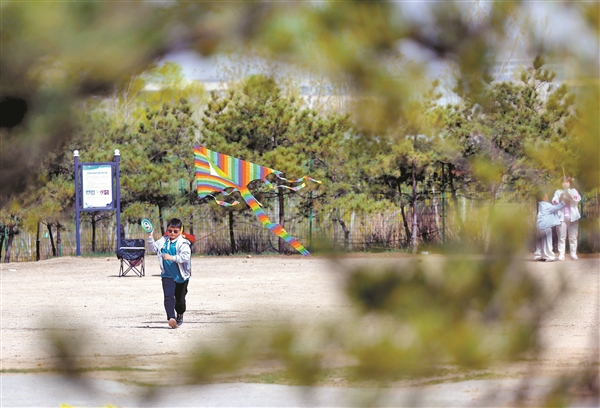 4月5日,在榆次区百草坡森林植物园,市民趁着晴好天气走出家门,享受春日放风筝的乐趣。